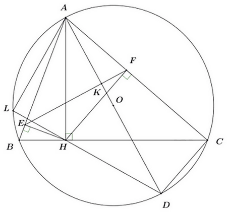 Cho tam giác \(ABC\) nhọn \((AB < AC)\) có đường cao \(AH\) và nội tiếp đường tròn \(\left( O \right)\). Gọi \(E,F\) lần lượt là hình chiếu của \(H\) lên các cạnh \(AB,AC\). Đường kính \(AD\) của \(\left( O \right)\) cắt \(EF\) tại \(K\) và \(DH\) cắt \(\left( O \right)\) tại \(L(L\) khác \(D)\).