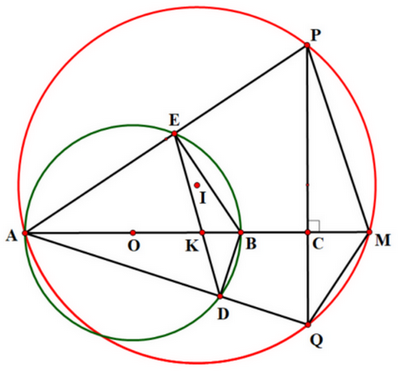 Cho đường tròn tâm \(O\), đường kính \(AB\) cố định. Trên tia đối của tia \(BA\) lấy điểm \(C\) cố định, qua \(C\) kẻ đường thẳng \(d\) vuông góc với \(AC\). Gọi \(K\) là điểm cố định nằm giữa \(O\) và \(B\) \((K\) khác \(O\) và \(B)\), qua \(K\) vẽ dây cung \(ED\) bất kì của đường tròn \((O)\). Gọi \(P,\,\,Q\) lần lượt là giao điểm của \(AE\) và \(AD\) với đường thẳng \(d\). Đường tròn ngoại tiếp tam giác \(APQ\) cắt tia \(AC\) tại điểm \(M\) \((M\) khác \(A)\). Chứng minh rằng: