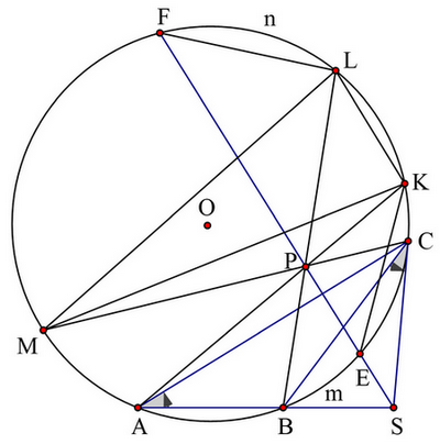 Cho tam giác tù \(ABC\) có \(\angle {ABC} > {90^0}\) nội tiếp đường tròn \((O).\) Tiếp tuyến tại \(C\) của \((O)\) cắt đường thẳng \(AB\) tại \(S.\) Lấy điểm \(P\) thuộc miền trong tam giác \(OAC\) sao cho \(SC = SP.\) Đường thẳng \(SP\) cắt \((O)\) tại hai điểm \(E,\;F\;(E\) ở giữa \(S\) và \(F).\) Các đường thẳng \(AP,\;BP\) cắt lại \((O)\) lần lượt tại \(K,\;L.\) Chứng minh rằng:
