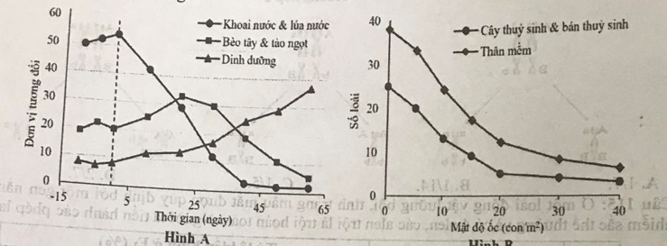 Ốc bươu vàng (Pomacea canaliculata) là loài ngoại lai có nguồn gốc từ Nam Mĩ được du nhập tới Đài Loan và phát triển mạnh ra khắp Đông Nam Á. Hình A thể hiện sự biến động mức độ che phủ của một số loài điển hình và hàm lượng dinh dưỡng trong nước ở ruộng nước ngọt trước và sau khi có mặt ốc bươu vàng (vào ngày 0). Hình B thể hiện mối quan hệ giữa mức độ giàu loài trong quần xã với số lượng ốc bươu vàng.