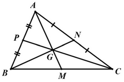 Ba đường trung tuyến của một tam giác cùng đi qua một điểm (hay đồng quy tại một điểm). Điểm đó cách mỗi đỉnh một khoảng bằng \(\dfrac{2}{3}\) độ dài đường trung tuyến đi qua đỉnh ấy.