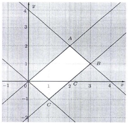 Cho hệ bất phương trình bậc nhất hai ẩn \(\left\{ {\begin{array}{*{20}{l}}{x - y \ge 0}\\{x - y \le 2}\\{x + y \ge 0}\\{x + y \le 4}\end{array}} \right.\) có miền nghiệm được biểu diễn là hình tứ giác OABC (tham khảo hình vẽ). Giá trị lớn nhất của biểu thức \(L = 2x + y\) bằng bao nhiêu?