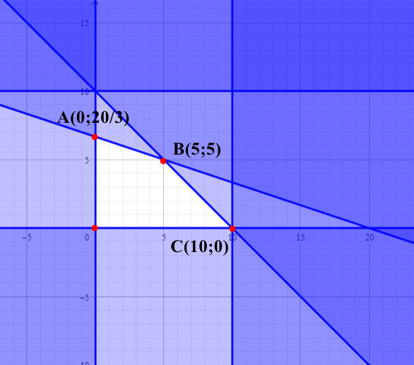 Để chế biến một hộp thực phẩm \({\rm{A}}\) cần \(0,2{\rm{\;kg}}\) cà chua và \(0,1{\rm{\;kg}}\) thịt; một hộp thực phẩm \({\rm{B}}\) cần \(0,2{\rm{\;kg}}\) cà chua và \(0,3{\rm{\;kg}}\) thịt. Lợi nhuận thu được từ 1 hộp thực phẩm \({\rm{A}}\) và 1 hộp thực phẩm \({\rm{B}}\) lần lượt là 4000 đồng và 5000 đồng. Chị Hoa có \(2{\rm{\;kg}}\) cà chua và \(2{\rm{\;kg}}\) thịt để sản xuất các hộp thực phẩm \({\rm{A}}\) và \({\rm{B}}\). Với lượng nguyên liệu như trên, lợi nhuận lớn nhất chị Hoa có thể thu được là bao nhiêu nghìn đồng?