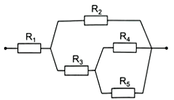 Cho mạch điện như hình bên. Các giá trị điện trở: \({R_1} = 6\Omega ;{R_2} = 4\Omega ;{R_3} = 2\Omega ;{R_4} = 3\Omega ;{R_5} = 6\Omega \). Khi dòng điện chạy qua điện trở R1 có cường độ 1A thì hiệu điện thế giữa hai đầu điện trở R2 có giá trị bao nhiêu Vôn?