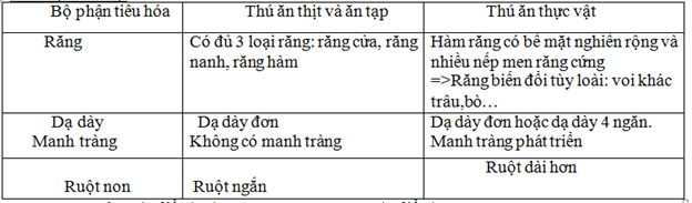 Nêu rõ sự sai khác cơ bản trong bộ phận tiêu hóa thức ăn của thú ăn thịt và ăn tạp so với thú ăn thực vật vào bảng sau: