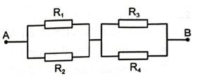 Cho mạch điện như Hình vẽ. Các giá trị điện trở: \({R_1} = 2\Omega ,{R_2} = 3\Omega ,{R_3} = 4\Omega \), \({{\rm{R}}_4} = 6\Omega \) . Tính điện trở của đoạn mạch AB. (đơn vị: \(\Omega \)).