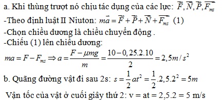 Một vật có khối lượng 2kg đặt trên mặt bàn nằm ngang. Hệ số ma sát trượt giữa vật với mặt bàn là 0,25. Vật bắt đầu được kéo bằng một lực F =10N có phương nằm ngang. Lấy g = 10 .Tính gia tốc của vật. Tính vận tốc và quãng đường vật đi được sau 2s.