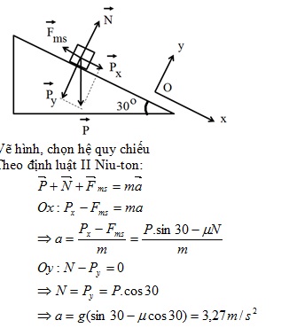 Một vật được thả trượt không vận tốc đầu từ đỉnh một mặt phẳng nghiêng 300 so với phương ngang. Hệ số ma sát trượt giữa vật và mặt phẳng là 0,2. Lấy g=10m/s2. Tìm gia tốc chuyển động của vật?