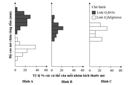 Hình bên mô tả mối quan hệ về độ cao mỏ khác nhau giữa các nhóm cá thể của hai loài chim sẻ ăn hạt G. fuliginosa và G. fortis thuộc quần đảo Galapagos qua thời gian dài trong hai trường hợp: khi sống chung trên một đảo (Hình A), khi sống riêng trên hai đảo (Hình B, C).