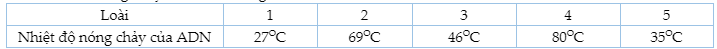 Nhiệt độ để phá vỡ các liên kết hiđrô và làm tách hai mạch của phân tử ADN mạch kép được gọi là nhiệt độ nóng chảy. Khi xét các đoạn phân tử ADN này có cùng chiều dài, người ta thu được kết quả thể hiện nhiệt độ nóng chảy của ADN trong nhân tế bào ở 5 sinh vật khác nhau: