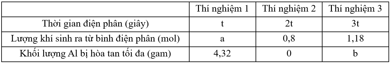 Dung dịch X chứa CuSO4, H2SO4 và NaCl. Điện phân dung dịch X (điện cực trơ, có màng ngăn xốp, hiệu suất điện phân là 100%), lượng khí sinh ra tử quả trình điện phân và khối lượng Al kim loại bị hòa tan tối đa trong dung dịch sau điện phân ứng với mỗi thí nghiệm được cho ở bảng dưới đây