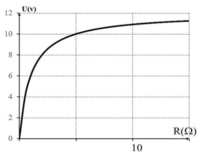 Cho mạch điện kín gồm một nguồn điện không đổi có suất điện động 12 V, điện trở trong r, mạch ngoài là một biến trở R. Đồ thị bên biểu diễn sự phụ thuộc của hiệu điện thế giữa hai điện cực vào biến trở như hình bên. Điện trở trong của nguồn có giá trị bằng