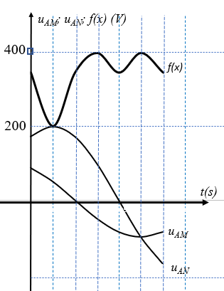 Đặt một điện áp xoay chiều có giá trị hiệu dụng và tần số không đổi vào hai đầu một đoạn mạch AB theo đúng thứ tự gồm có điện trở R, tụ điện C, hộp kín X mắc nối tiếp với nhau. Gọi M là điểm giữa điện trở và tụ điện, N là điểm giữa tụ điện và hộp kín X, \({f_{\left( x \right)}}\) là tổng độ lớn điện áp tức thời giữa hai đầu đoạn mạch AN và độ lớn điện áp tức thời giữa hai đầu hộp kín X. Đồ thị \({f_{\left( x \right)}}\) và \({u_{AM}},\,\,{u_{AN}}\) theo thời gian được mô tả như hình bên. Hệ số công suất của đoạn mạch AB gần nhất với giá trị nào sau đây?