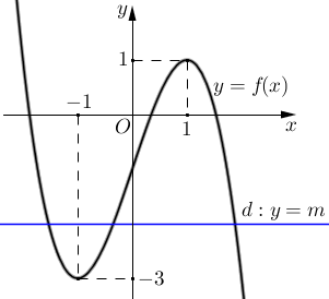 Cho hàm số bậc ba \(y = f\left( x \right)\) có đồ thị là đường cong trong hình bên. Có bao nhiêu giá trị nguyên của tham số \(m\) để phương trình \(f\left( x \right) = m\) có ba nghiệm thực phân biệt?