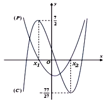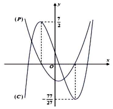 Cho hai hàm số \(f\left( x \right) = {x^3} + a{x^2} + bx + c\) và \(g\left( x \right) = {x^2} + mx + n\) có đồ thị lần lượt là các đường cong \(\left( C \right)\) và \(\left( P \right)\) như hình vẽ. Diện tích hình phẳng giới hạn bởi đồ thị hàm số \(y = \dfrac{{g\left( x \right)}}{{f\left( x \right) + 3}}\) và trục hoành bằng