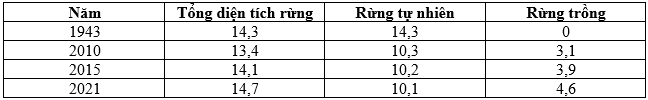 Cho bảng số liệu: DIỆN TÍCH RỪNG NƯỚC TA GIAI ĐOẠN 1943 – 2021 (Đơn vị: triệu ha) (Nguồn: