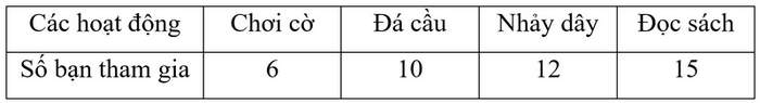Bảng số liệu sau cho biết "Số bạn tham gia các hoạt động trong một giờ ra chơi" của lớp