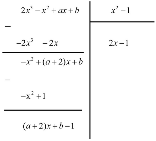 Xác định \({\rm{a}}\) và \({\rm{b}}\) để đa thức \(2{{\rm{x}}^3} - {{\rm{x}}^2} + {\rm{ax}} + {\rm{b}}\) chia hết cho đa thức \({{\rm{x}}^2} - 1\)
