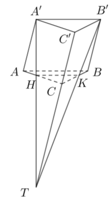 Cho lăng trụ \(ABC.A'B'C'\) có cạnh bên bằng \(\sqrt 2 \), đáy \(ABC\) là tam giác vuông tại \(B,\,\,BC = \sqrt 3 ,\,\,AB = 1\), hình chiếu của \(A'\) lên mặt phẳng \(\left( {ABC} \right)\) là điểm \(H\) thỏa mãn. Tính khoảng cách giữa \(AA'\) và \(BC\)