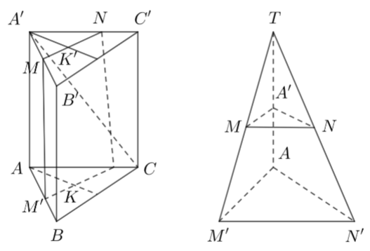 Cho lăng trụ đều \(ABC.A'B'C'\) có cạnh đáy bằng \(a\), chiều cao bằng \(2a\). Gọi \(M\) là trung điểm của \(A'B',\,\,N\) là điểm thuộc cạnh \(A'C'\) sao cho \(A'N = \dfrac{2}{3}A'C',\,\,K\) là trọng tâm tam giác \(ABC\). Mặt phẳng \(\left( {MNK} \right)\) chia khối lăng trụ thành hai phần. Tính thể tích phần có thể tích nhỏ hơn.
