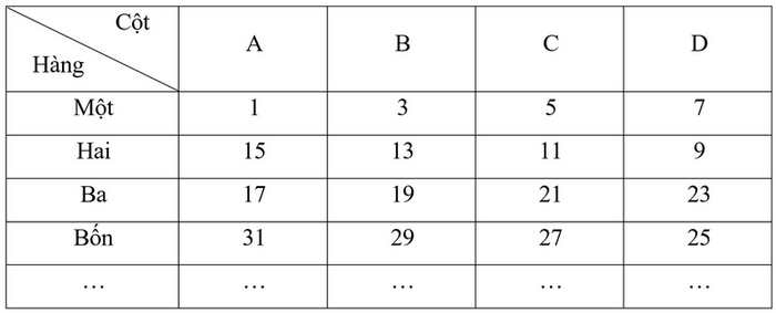 Các số tự nhiên lẻ 1, 3, 5, 7, …, 2021, 2023, … được điền vào một bảng dưới đây. Trong