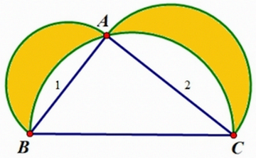 Cho tam giác ABC vuông tại A có AB = 6 cm, AC = 8 cm, BC = 10 cm và ba nửa hình tròn có đường kính