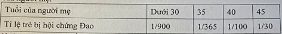 Dưới đây là kết quả thống kê của một nghiên cứu về mối liên hệ giữa tỉ lệ trè bị hội chứng Đao và tuổi của người mẹ.