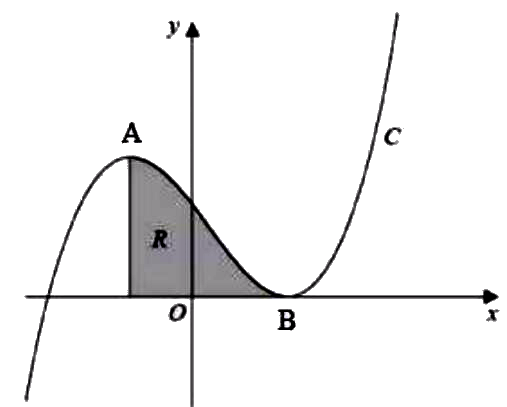 Hình trên là đồ thị \(\left( C \right)\) của hàm số \(y = {(x - 2)^2}\left( {x + 3} \right)\) với \(A,B\) lần lượt là hai điểm cực trị của \(\left( C \right)\). Diện tích hình phẳng \(R\) được tô đậm trong hình bằng