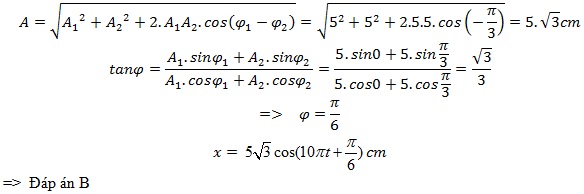 Một vật thực hiện đồng thời hai dao động điều hoà cùng phương, cùng tần số, có các phương trình dao động là x1= 5cos(10 πt) (cm) và x2= 5cos(10 πt + π/3) (cm). Phương trình dao động tổng hợp của vật
