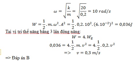 Một con lắc lò xo gồm vật nặng m=200g và lò xo có độ cứng k=20N/m đang dao động điều hoà với biên độ A=6cm. Vận tốc của vật khi qua vị trí có thế năng bằng 3 lần động năng có độ lớn: