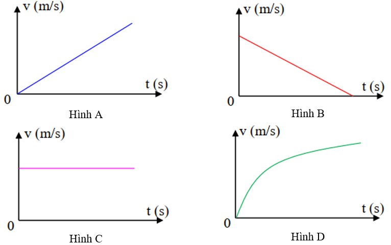 Vận tốc của vật rơi tự do phụ thuộc vào thời gian được biểu diễn theo dạng đồ thị nào sau đây?