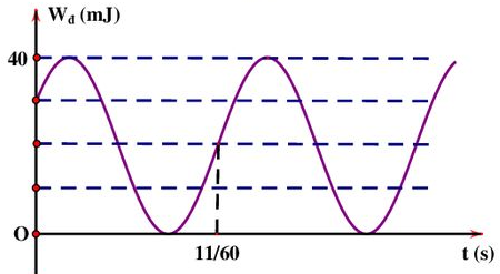 Một vật nhỏ có khối lượng 200 g dao động điều hòa dọc theo trục Ox, động năng của vật biến thiên tuần hoàn theo thời gian như hình vẽ. Biết tại thời điểm t = 0 vectơ gia tốc cùng hướng với trục Ox. Lấy \({\pi ^2} = 10\). Phương trình dao động của vật là