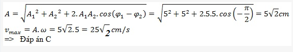 Một vật thực hiện đồng thời hai dao động điều hoà cùng phương, cùng tần số, có các phương trình dao động là x1 = 5cos(5t + π/6) (cm) và x2 = 5cos(5t - π /3) (cm). Vận tốc cực đại của vật trong quá trình dao động là