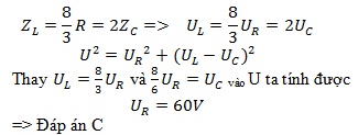 R = 2ZC. Hiệu điện thế hai đầu điện trở UR là