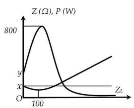 Cho đoạn mạch nối tiếp gồm điện trở R, tụ điện có điện dung C không đổi và cuộn thuần cảm có độ tự cảm L có thể thay đổi được. Đặt vào hai đầu đoạn mạch điện áp xoay chiều có giá trị hiệu dụng U và tần số không đổi. Điều chỉnh giá trị L thì công suất tiêu thụ và tổng trở của mạch biến đổi theo cảm kháng ZL của mạch như đồ thị hình bên. Giá trị x, y gần nhất với các giá trị nào sau đây?