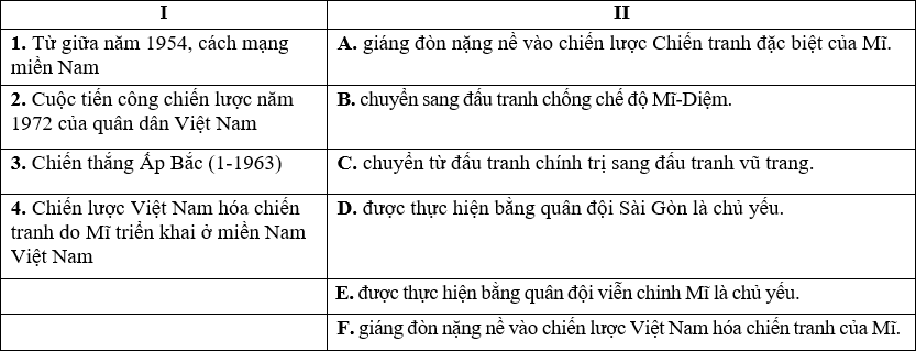 Ghép nội dung cột I với nội dung cột II để tạo thành một thông tin đúng với Lịch sử Việt Nam từ năm 1954 đến năm 1975.