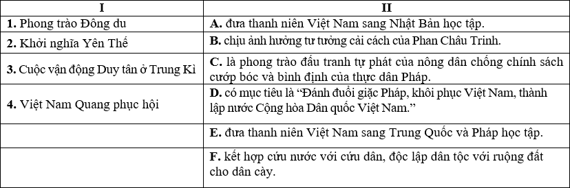 Ghép nội dung cột I với nội dung cột II để tạo thành một thông tin đúng với Lịch sử Việt Nam từ đầu thế kỉ XX đến năm 1918.