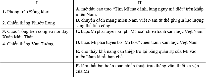 Ghép nội dung cột I với nội dung cột II để tạo thành một thông tin đúng với Lịch sử Việt Nam từ năm 1954 đến năm 1975.