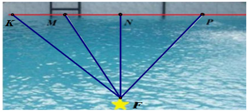 Hình vẽ dưới đây mô tả đường bơi của bốn bạn trong một bể bơi. Bạn Sơn bơi từ vị trí điểm \({\rm{K}}\) đến vị trí điểm \({\rm{F}}\), bạn Nam bơi từ vị trí điểm \({\rm{M}}\) đến vị trí điểm \({\rm{F}}\), bạn Bắc bơi từ vị trí điểm \({\rm{N}}\) đến vị trí điểm \({\rm{F}}\), bạn Chiến bơi từ vị trí điểm \({\rm{P}}\) đến vị trí điềm \({\rm{F}}\). Đường bơi của bạn nào ngắn nhất?