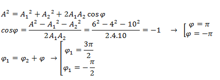 Cho hai dao động cùng phương : x1 = 4cos (10t + φ1)( cm ) và x2 = 10cos( 10t + π/2 ) (cm). Dao động tổng hợp của hai dao động trên có biên độ là 6 cm khi :