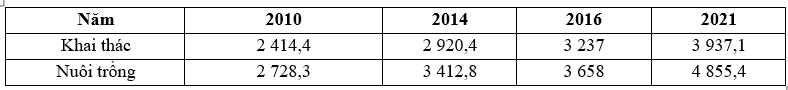 Cho bảng số liệu sau: SẢN LƯỢNG THỦY SẢN NƯỚC TA GIAI ĐOẠN 2010 – 2021 (Đơn vị: nghìn