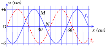 Một sóng hình sin đang truyền trên một sợi dây theo chiều dương của trục Ox. Hình vẽ mô tả hình dạng của sợi dây tại thời điểm \({t_1}\) (đường nét đứt) và \({t_2} = {t_1} + 0,25\,\,\left( s \right)\) (đường nét liền). Tại thời điểm \({t_2}\), tốc độ dao động của phần tử M trên dây là