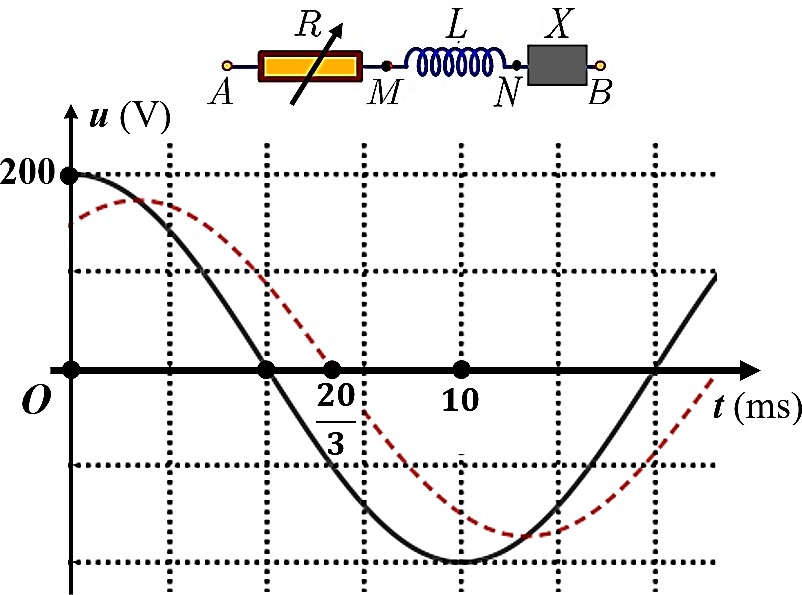 Khi \(R = 100\Omega \)thì đồ thị sự phụ thuộc của \({u_{AB}}\)(đường nét liền) và uMB (đường nét đứt) theo thời gian có quan hệ như hình vẽ.