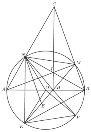 Trên đường tròn tâm \(O\) đường kính \(AB = 2R\) lấy điểm \(N\) sao cho \(AN = R\) và \(M\) là một điểm thay đổi trên cung nhỏ \(BN\) (\(M\) khác \(B\) và \(N\)). Gọi \(I\) là giao điểm của \(AM\) và \(BN,H\) là hình chiếu của \(I\) trên \(AB,IH\) cắt \(AN\) tại \(C,K\) là điểm đối xứng với \(N\) qua \(AB.\)