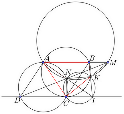 Cho hình bình hành \(ABCD\) có \(CB = CA.\) Gọi \(M\) là điểm bất kỳ trên tia đối của tia \(BA.\) Đường tròn ngoại tiếp tam giác \(ACD\) cắt \(MD\) tại \(N\) \((N\)khác \(D),\) đường tròn ngoại tiếp tam giác \(AMN\) cắt \(MC\) tại \(K\) \((K\) khác \(M).\)