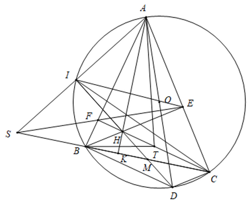 Cho tam giác \(ABC\) nhọn \((AB < AC)\) nội tiếp đường tròn \((O),\) các đường cao \(BE\) và \(CF\) cắt nhau tại \(H.\) Gọi \(S\) là giao điểm của đường thẳng \(BC\) và \(EF;\) \(I\) là giao điểm của \(SA\) và đường tròn \((O)\) (với \(I\) khác \(A\)).