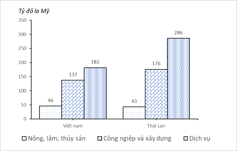 Cho biểu đồ: TỔNG SẢN PHẨM TRONG NƯỚC (GDP) THEO NGÀNH KINH TẾ CỦA VIỆT NAM VÀ THÁI LAN NĂM