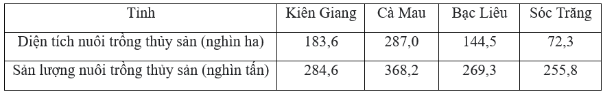 Cho bảng số liệu sau: DIỆN TÍCH NUÔI TRỒNG THỦY SẢN VÀ SẢN LƯỢNG THỦY SẢN NUÔI TRỒNG Ở