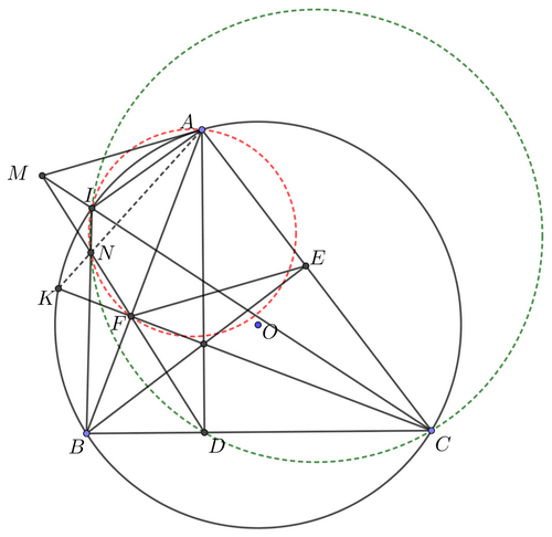 Cho tam giác \(ABC\) nhọn nội tiếp đường tròn tâm \(O\), các đường cao \(AD,\,BE,\,CF\) (\(D \in BC,\,E \in CA,\,F \in AB\)). Tiếp tuyến tại \(A\) của đường tròn \((O)\) cắt \(DF\) tại \(M\), \(MC\) cắt \((O)\) tại \(I\) khác \(C\), \(IB\) cắt \(MD\) tại \(N\).