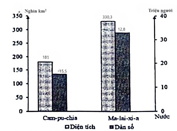 Theo biểu đồ, nhận xét nào sau đây đúng về diện tích và dân số của Cam-pu-chia và Ma-lai-xi-a?